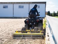 The riding arena plow & drag / groomer is for leveling and hoeing riding areas. The plow has spring spikes / tines with an adjustable working height for surface hoeing. Adjusting the working angle of the side- and rear plow blades allows for the surface at the edges of the riding arena to be shifted back to the middle. There are rubber edges and an adjustable perimeter wheel to protect the walls of a riding arena. The finishing roller compacts the soil, giving it a lovely, polished look. The riding arena leveler can be towed by all vehicles equipped with a 50 mm/2” ball hitch unit and with a towing eyelet (22. 050S) installed as an optional accessory. The trailer can also be towed by hitching it to other vehicles equipped with a coupling device. Setting the transportation position and operating depth is done with a manual lifting mechanism (included) or a 12V electrohydraulic cylinder (p/n 70.2800) installed as an optional accessory.